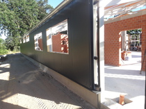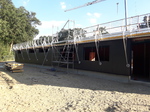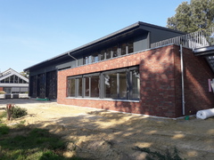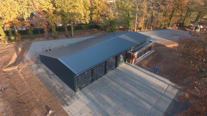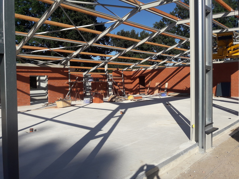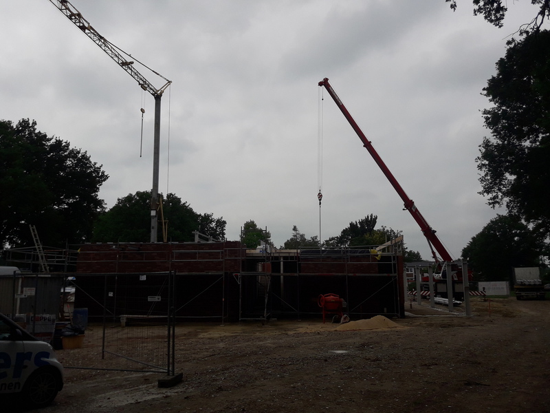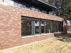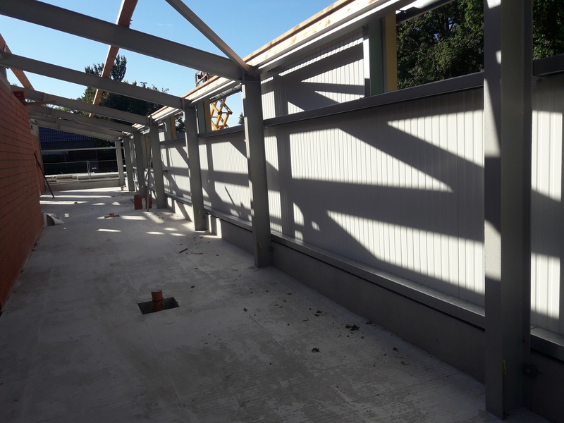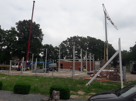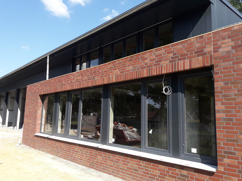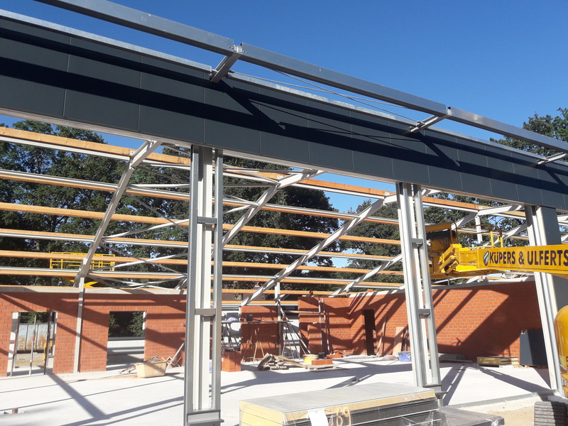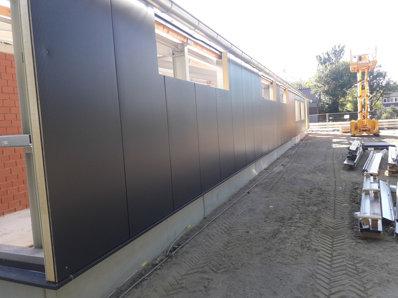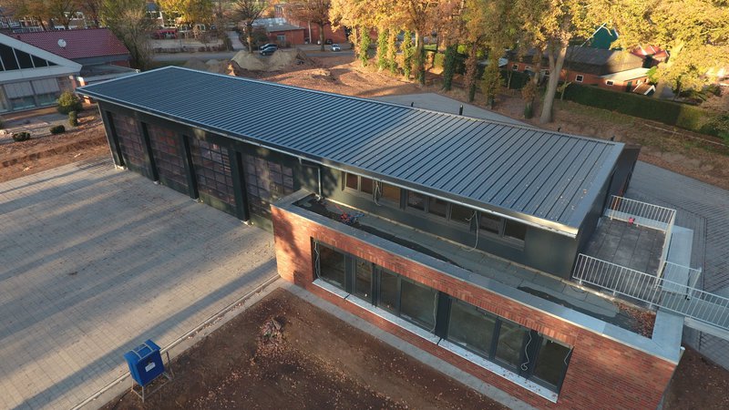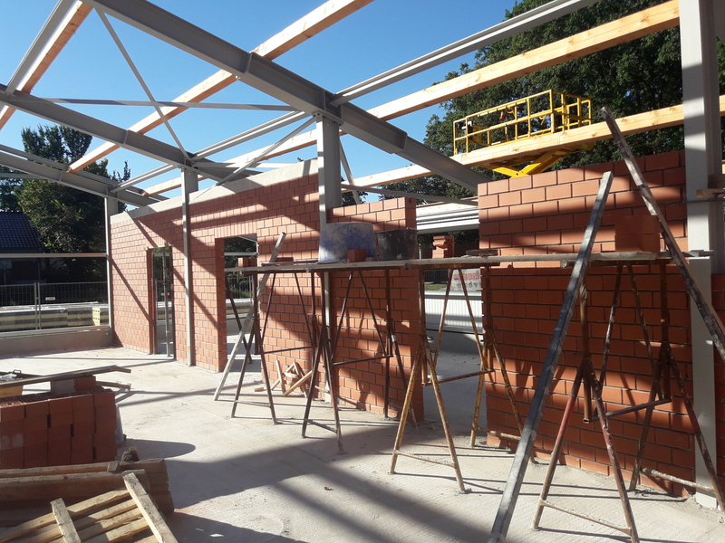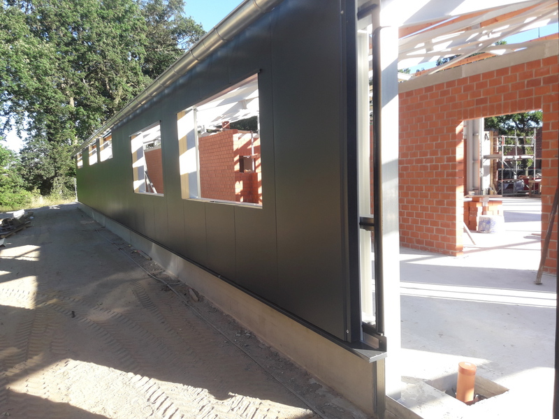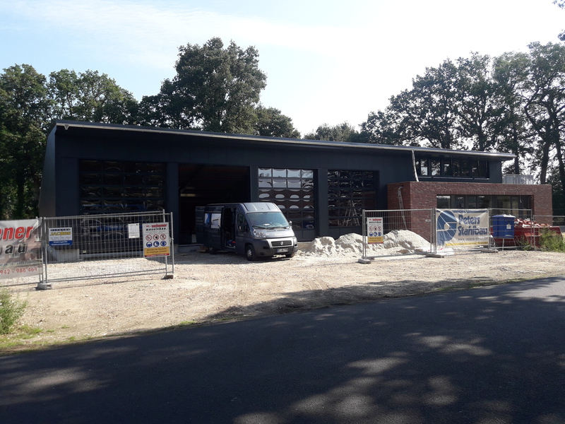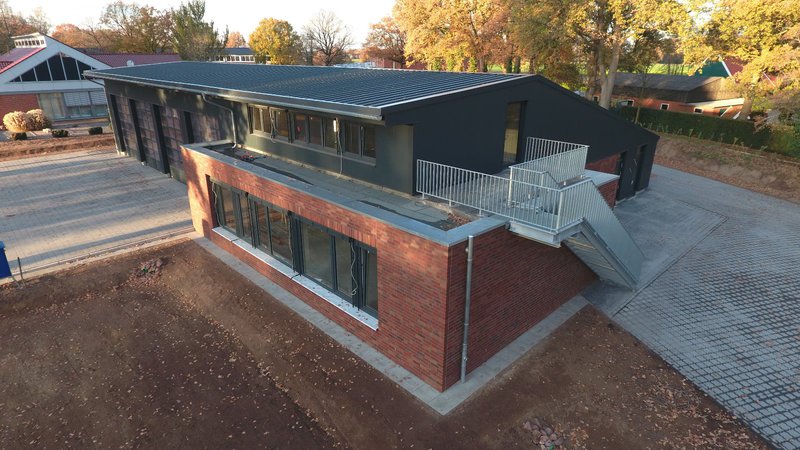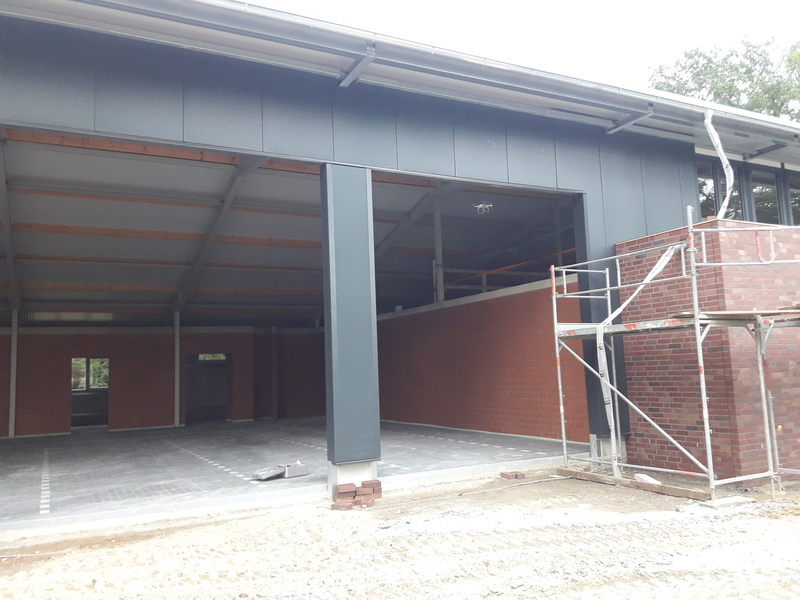 In den vergangenen Wochen hat sich einiges am Neubau getan. Mit dem Verblenden der Außenwände ist begonnen worden und zum größten Teil fertig gestellt. Auch die Fahrzeughalle macht Fortschritte, so wurden in den vergangenen Tagen die Hallenwände montiert.