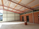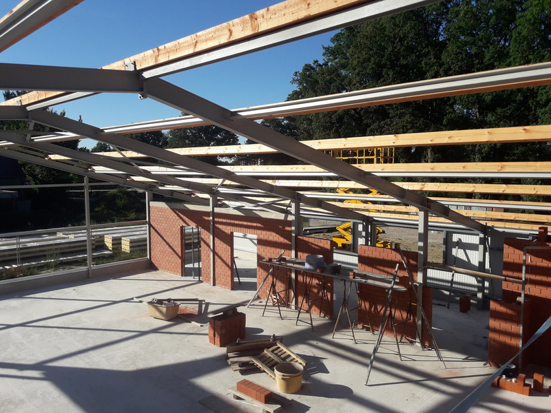 Es hat sich viel getan. Die Stahlkonstruktion der Halle wurde mit den großflächigen Sandwichplatten verkleidet. Auch der Gebäudeteil in dem später die Büros uns Schulungsräume eingerichtet werden ist verklinkert worden. Das spätere Aussehen ist so schon gut zu erkennen.