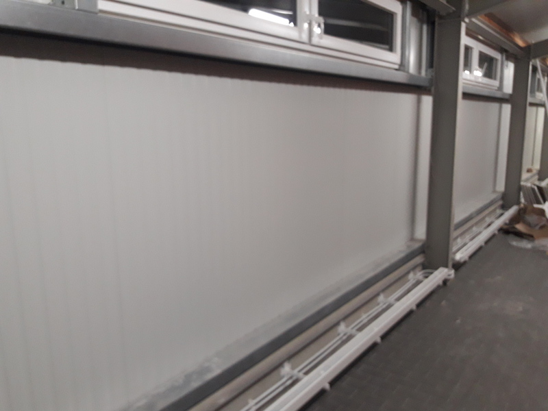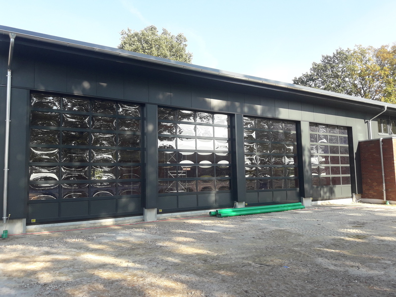 Es hat sich wieder einiges getan seit dem letzten Bericht. Wie man von außen bereits sehen kann, sind die Hallentore montiert.Der Innenbereich der Fahrzeughalle macht auch große Fortschritte. So wurde bereits ein großer Teil der Bodenfliesen verlegt.